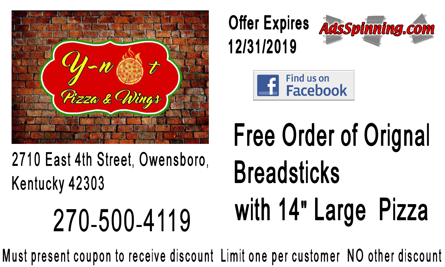 Y Not Pizza and Wings2710 Highway 144 Owensboro, KY 42303 270-500-4119https://ynotpizzas.com